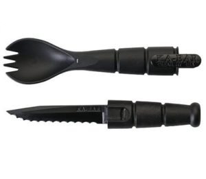 The Ka-Bar Spoon Fork Knife (Tactical Spork) is a high-quality knife for camping, hunting, fishing, recreation, military, and law enforcement. It is equipped with a fork/spoon combo and the knife is accessed by pulling the spork in the opposite direction. The knife dimension is 7 * 2 * 1 inches. The weight of the knife is 3.52 ounces.